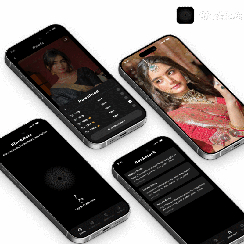 The screenshots clearly show what Blackhole delivers: a simple home screen where users paste a link, a smooth video preview screen, an organized collection grid and a clean bookmark manager. With these core features, Blackhole helps you create a user-friendly experience that feels premium and modern.