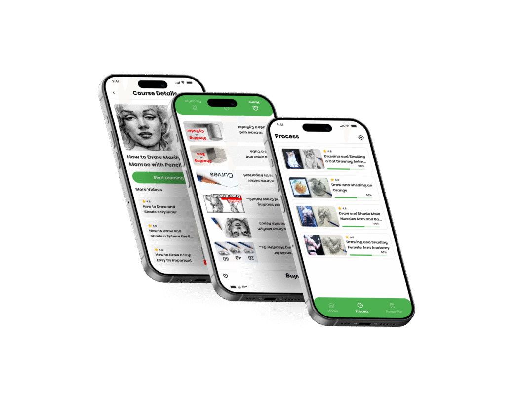 This app is built specifically for step-by-step drawing lessons, covering shading, shapes, curves, anatomy sketches, and realistic pencil drawing techniques. Every screen shown in the screenshots is designed with simplicity and clarity so users can learn without confusion. With smooth navigation, visually rich cards, rating systems, and lesson progress tracking, the Drawing Learning app creates a modern and interactive learning experience.